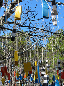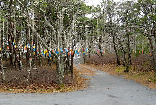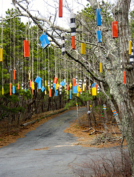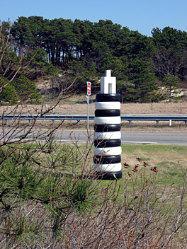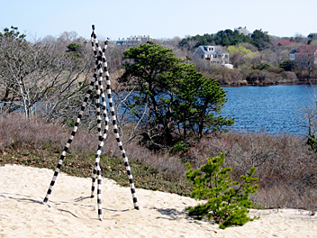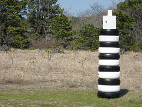 Appearances: Provincetown Green Arts Festival is an annual arts festival held in April. The festival now occupies a former wooded campground and occupies local museum and gallery spaces around town during the 10 day event. I was invited to participate in the festival in 2012. I created a tripod tower of locally sourced scrub pine, which I banded with charcoal and white pigment mixed with acrylic with a solar powered light atop. The piece was sited above a beautiful kettle pond within view of homes and a park observation deck. That year I also exhibited a tower of black and white banded automobile tires with a wooden temple atop. The tire tower was sited along the busy Route 6 that leads to Provincetown and the beaches of the National Seashore.