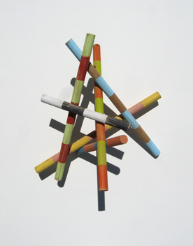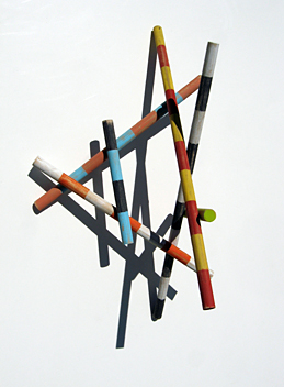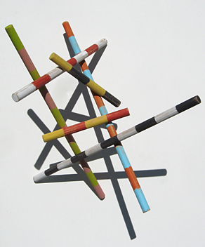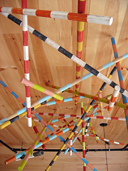 My studio is located in the village center of Freedom, ME. Across the street is a beautiful old mill that had fallen into disrepair. The Mill at Freedom Falls was built by John True in 1834 as a gristmill on Sandy Stream and functioned as an industrial site for 133 years. I had heard for years that the mill contained racks and piles of turned wooden dowels that had been manufactured in the old mill. Several years ago, the building was purchased and a beautiful restoration begun in 2012. The building is now home to a school, an office and a restaurant. I approached the owner and developer to create a sculpture for the school dining room ceiling. I proposed a suspended sculpture of colorfully banded wooden dowels that would utilize the ash and maple turned dowels the owner had set aside as products of the old mill. The students now dine under this array of brightly colored dowels manufactured in the same space as their classrooms over 45 years earlier.
